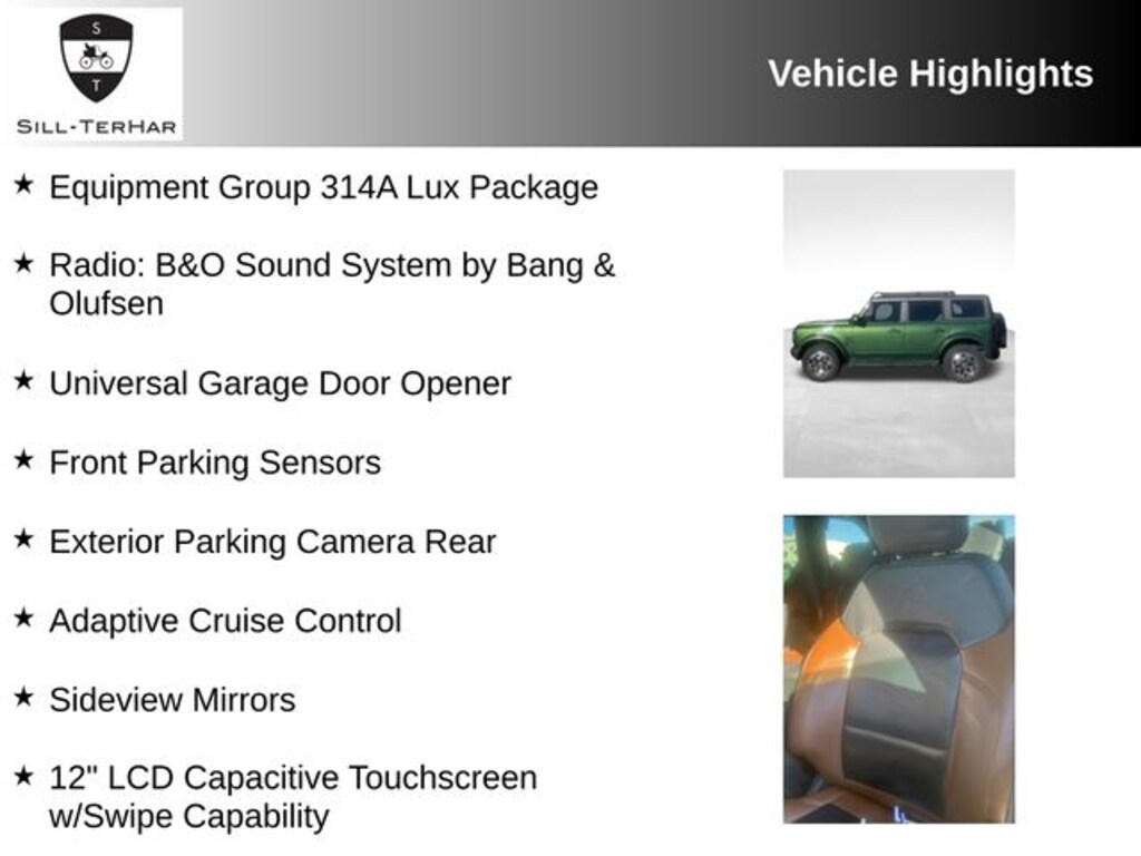 This 2022 Ford Bronco is rare!, 12" LCD Capacitive Touchscreen w/Swipe Capability, 2 Smart Charging USB Ports In Dashboard, 360-Degree Camera, Adaptive Cruise Control, Additional Sound Deadening, Connected Built-In Navigation, Equipment Group 314A Lux Package, Evasive Steering Assist, Exterior Parking Camera Rear, Front Parking Sensors, Heated Steering Wheel, Information on Demand Panel, Radio: B&O Sound System by Bang & Olufsen, Sideview Mirrors, Universal Garage Door Opener, Wireless Charging Pad.