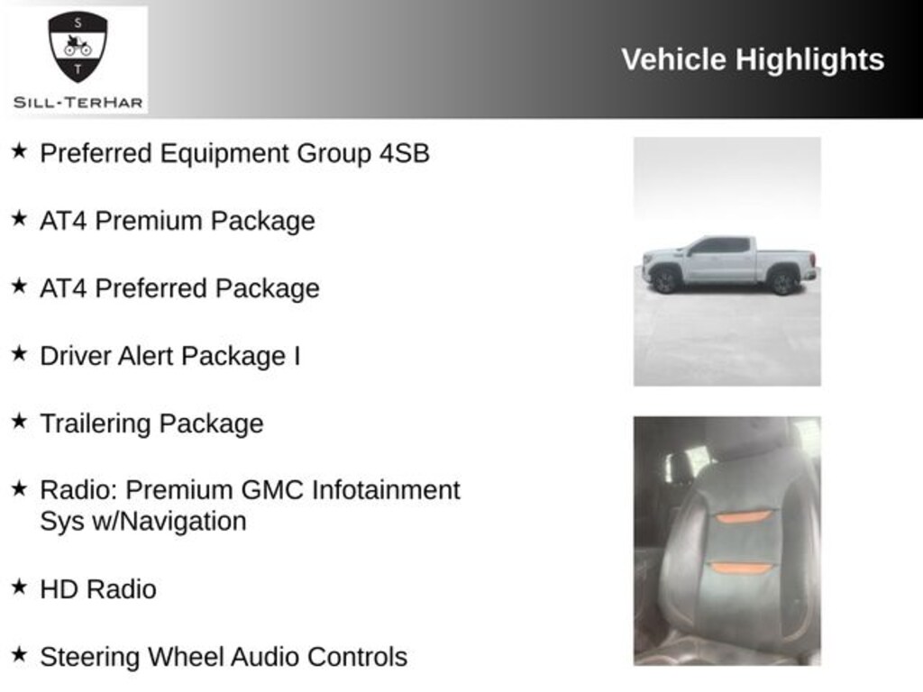 - This Sierra 1500 AT4 is equipped with an impressive array of premium features, including the AT4 Preferred Package, AT4 Premium Package, Driver Alert Package I, and the Trailering Package.