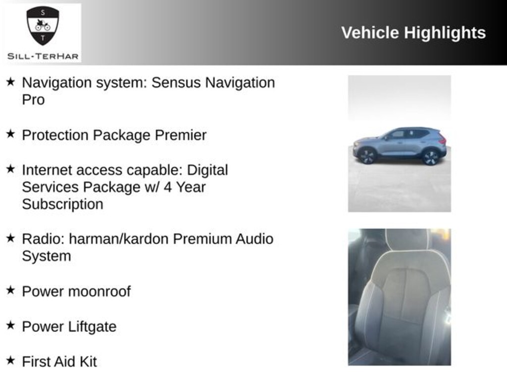 This 2024 Volvo XC40 Recharge Pure Electric is rare!, All-Weather Floor Mats, Apple CarPlay, Cargo Tray, First Aid Kit, Heated Front Seats, Heated rear seats, Internet access capable: Digital Services Package w/ 4 Year Subscription, Navigation system: Sensus Navigation Pro, Power Liftgate, Power moonroof, Protection Package Premier, Radio: harman/kardon Premium Audio System, Wheel Locks, Wheels: 20" 5-Spoke Black Diamond-Cut Alloy.