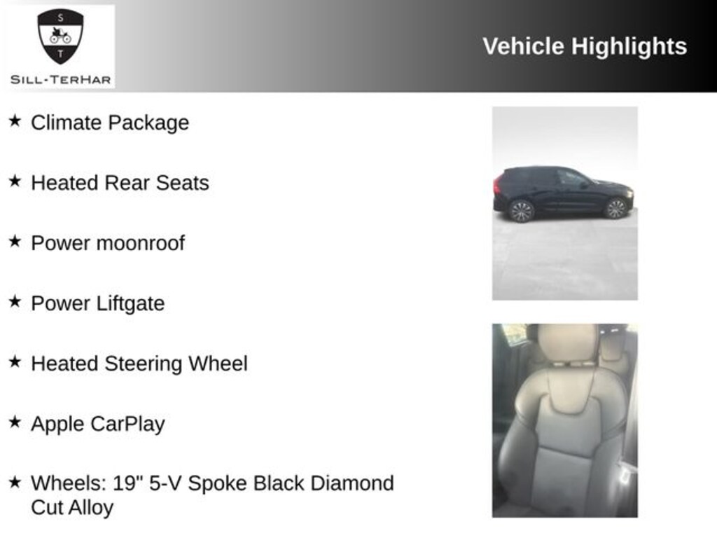 This 2025 Volvo XC60 is rare!, Apple CarPlay, Climate Package, Heated Rear Seats, Heated Steering Wheel, Power Liftgate, Power moonroof, Wheels: 19" 5-V Spoke Black Diamond Cut Alloy.
